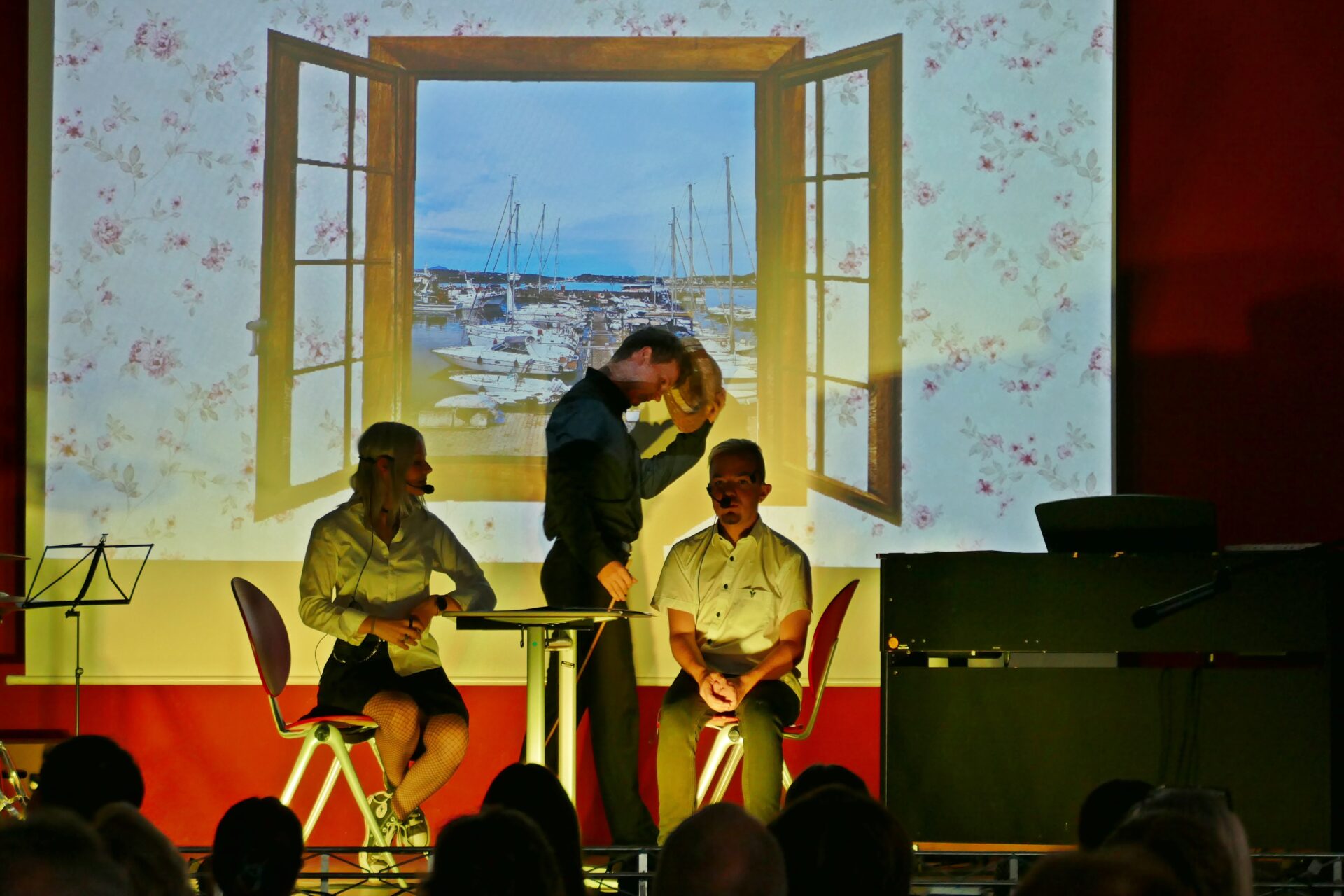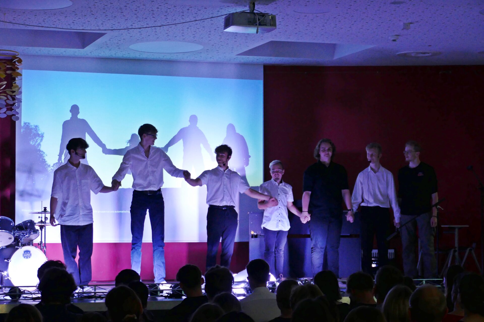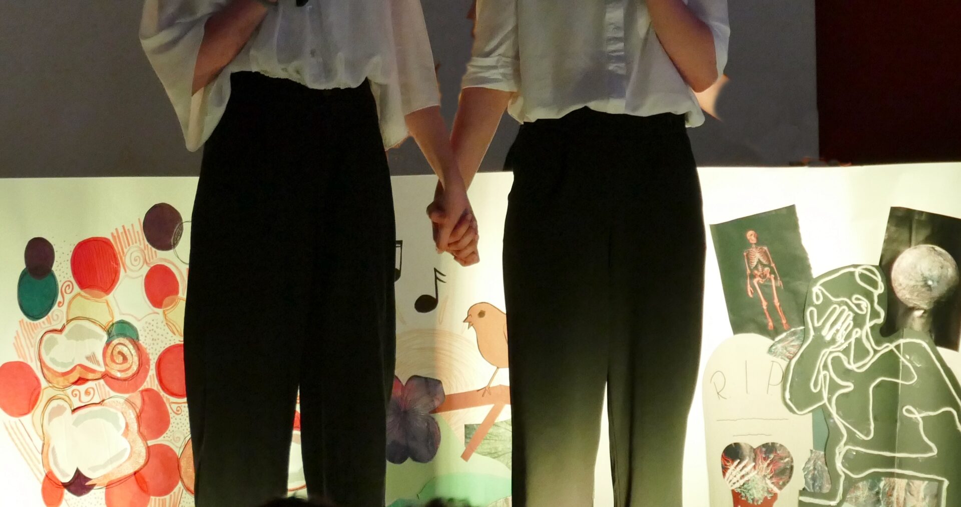 So bekam Goethes Maifest im wahrsten Sinne des Wortes einen neuen Anstrich und wurde durch das Aufrollen einer riesigen Papiercollage bebildert. Texte von Durs Grünbein und Ulla Hahn wurden mit Klavier und Klarinette vertont und begannen plötzlich zu schweben. Viele weitere Texte zum Thema Kindheit, (falsche) Freunde, Beziehungen, Schattenspringen, Rebellion und Familie wurden mit Performance-Kunst, Videos und Bildern untermalt und sorgten nicht selten für Gänsehautmomente. Dabei war das Motto des Abends stets deutlich spürbar: zusammen schaffen wir mehr als allein. Zu sehen, wie die Schülerinnen und Schüler sich gegenseitig auf der Bühne unterstützten und feierten, war einfach wunderbar.
