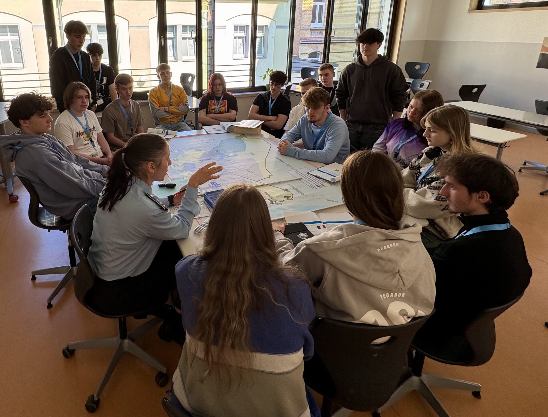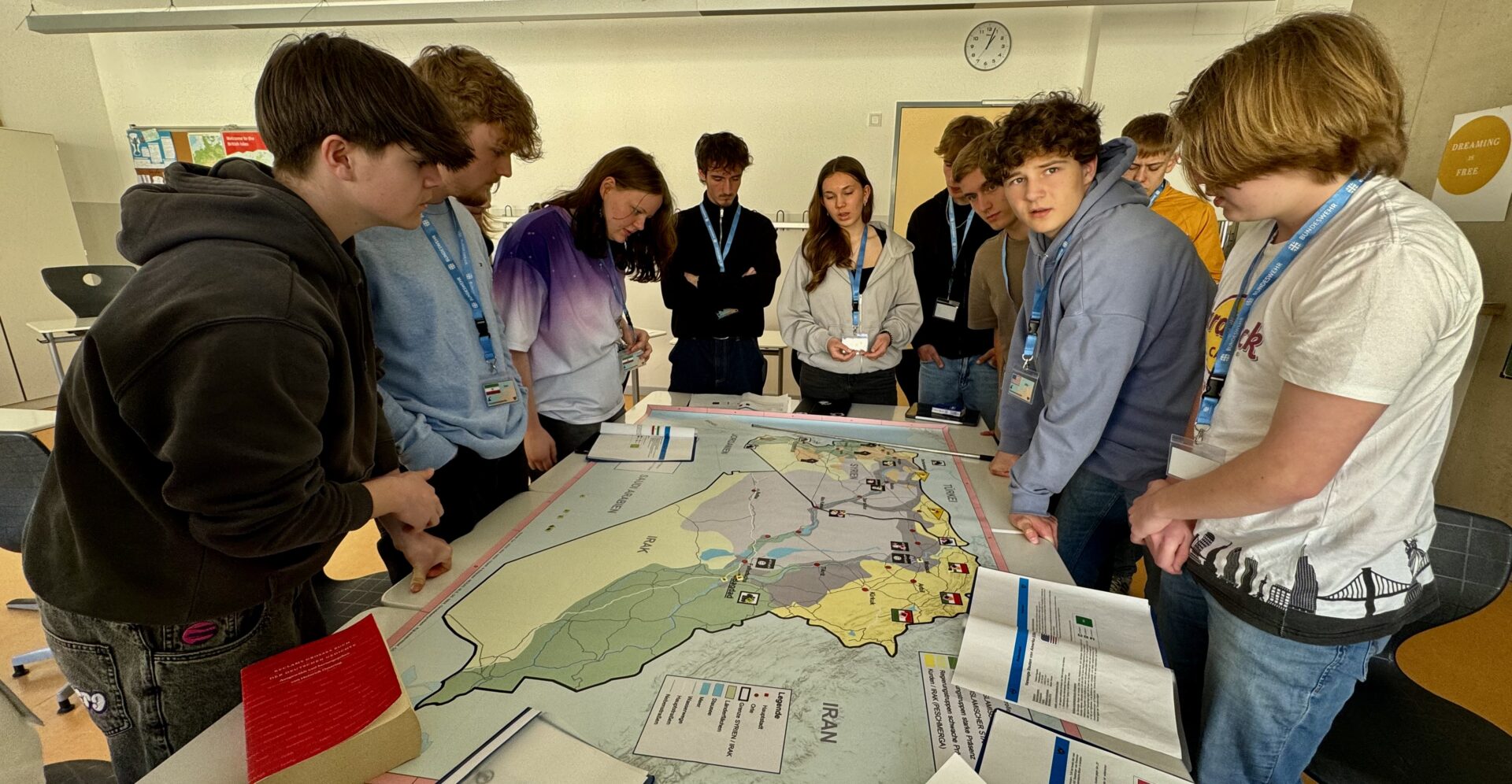 Darauf folgend überprüften die Schülerinnen und Schüler als nächstes an einer großen Karte, wie sie mit ihren staatlichen Mitteln das gemeinsame Ziel erreichen konnten. „Wo können wir Angriffe starten, um den islamischen Staat zurückzudrängen, damit die Bürgerinnen und Bürger wieder in Freiheit leben?“ und „Wo müssen wir Diplomaten und Entwicklungshelfer einsetzen, um Regionen wieder aufzubauen?“